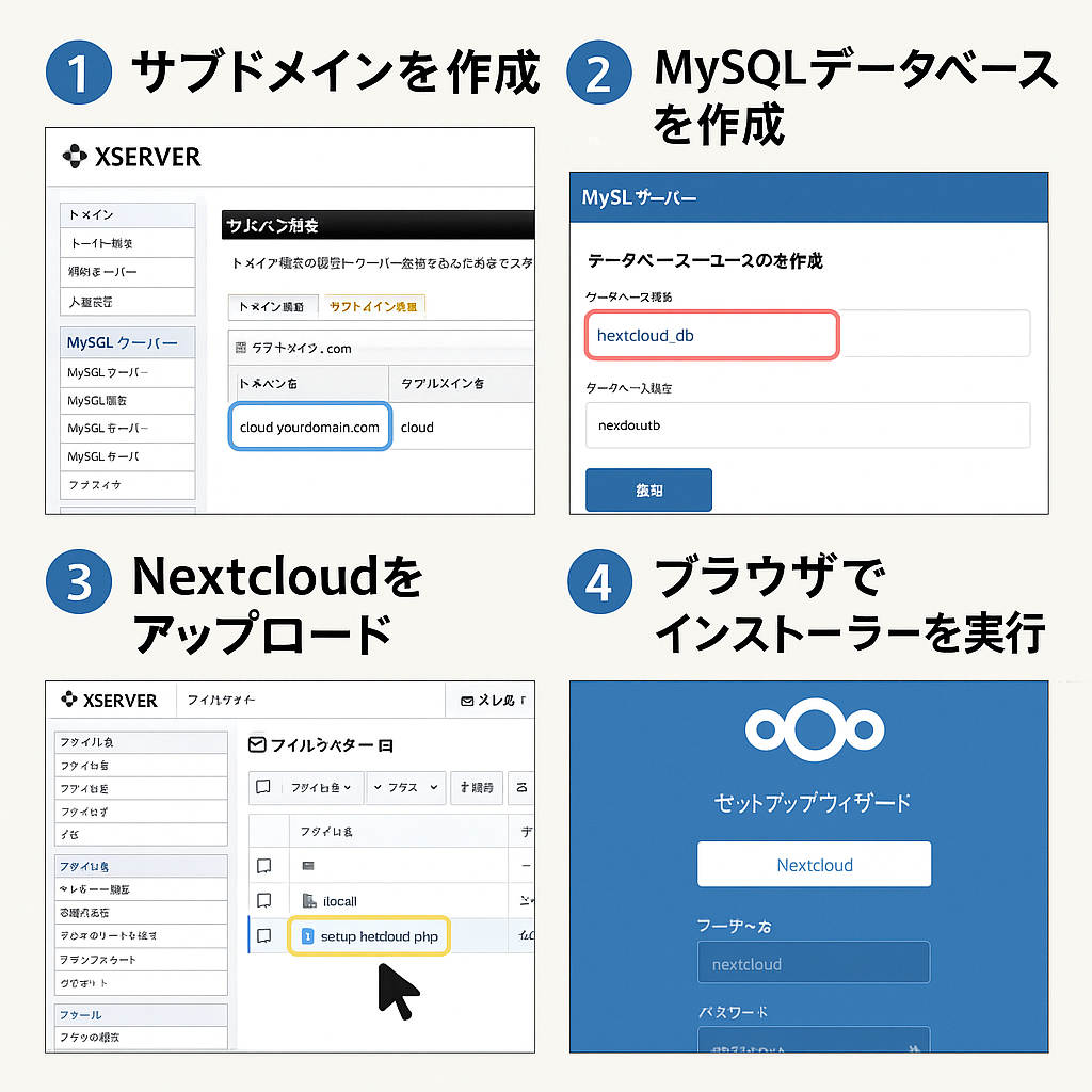 ブラウザからあなたのURL(例:https://cloud.yourdomain.com)を開き、