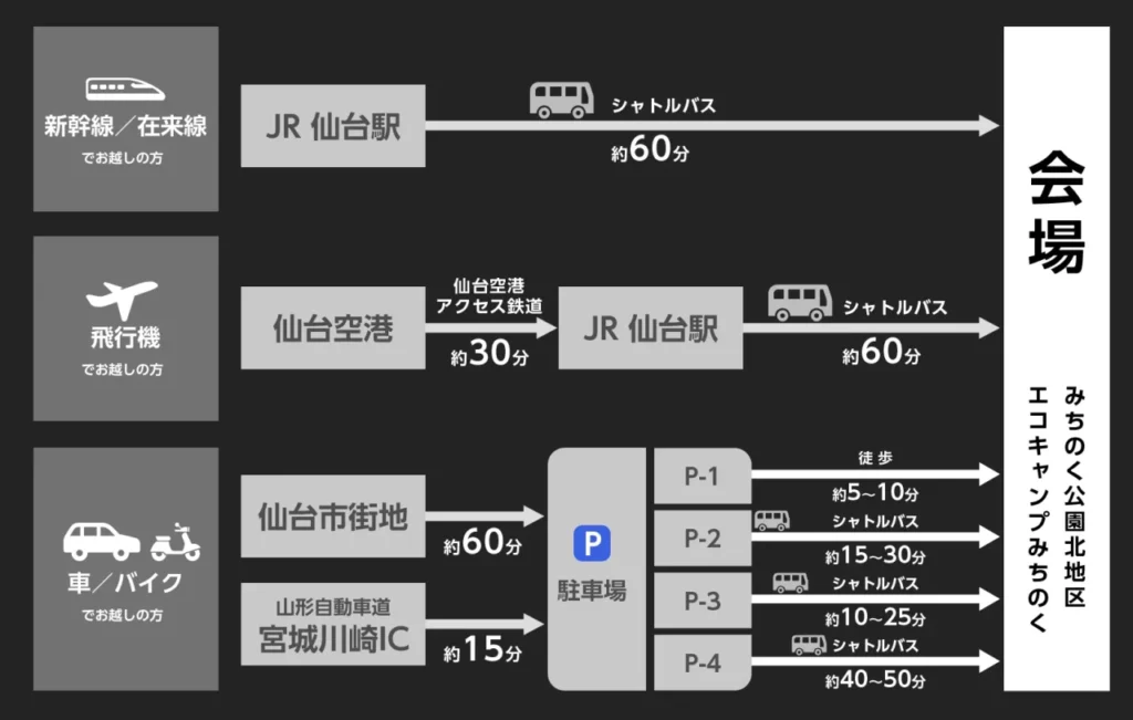 開催中は仙台駅から会場の「エコキャンプみちのく」まで行くことができる臨時シャトルバスが運行されます。