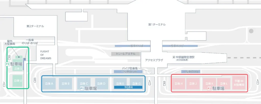 セントレア空港の駐車場にはP1・P2・P3があり、それぞれにアルファベットで分けられた立体駐車場があります。