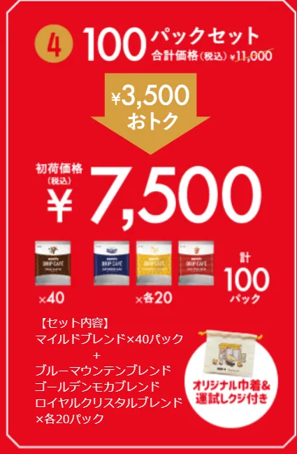 ドリップカフェセットはどのセットもコーヒー1杯100円以下で飲めるのでとてもお得ですね!
