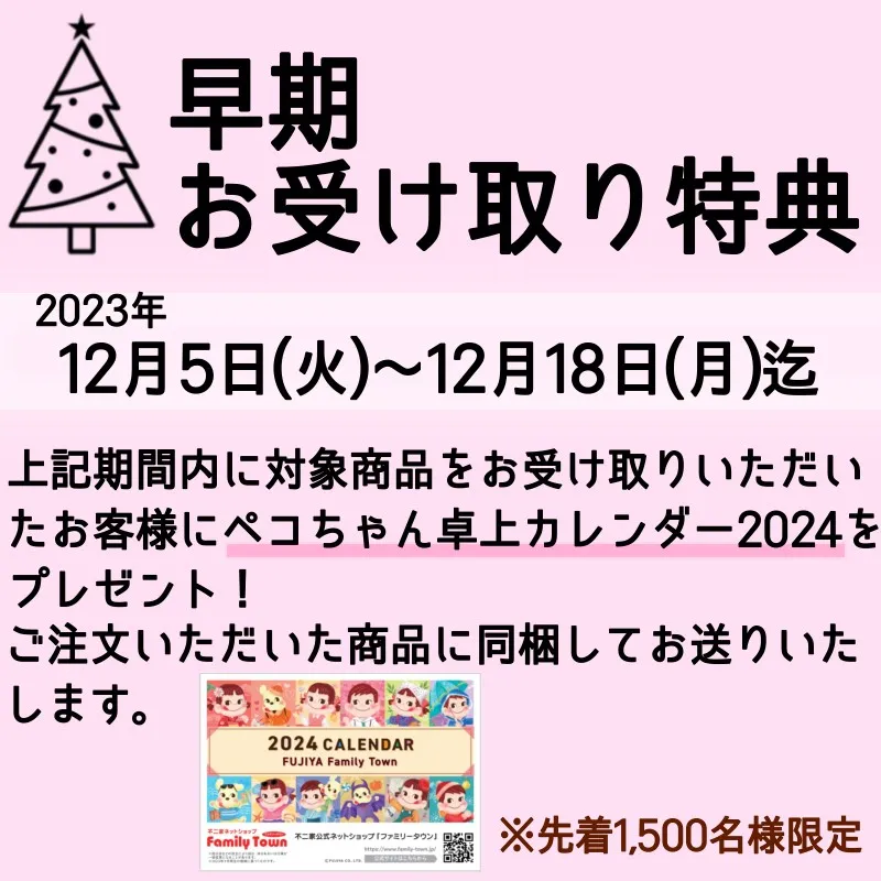 不二家公式ネットショップFamilyTownで予約したクリスマスケーキを早期に受け取ると、ペコちゃん卓上カレンダー2024をもらえます。