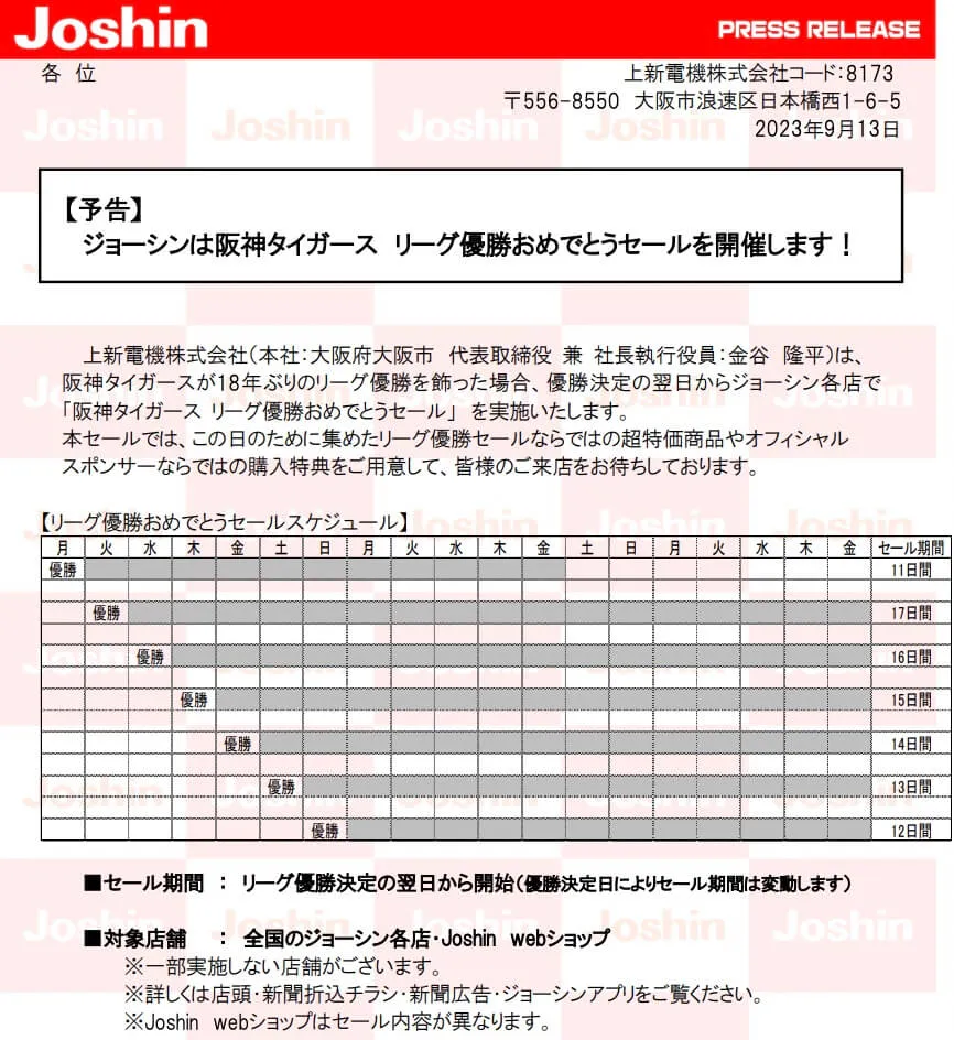 阪神優勝セール2023を実施する、または実施すると予想されるジョーシンなどの店舗や企業を以下にまとめました。