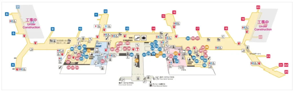 こちらのフロアマップの[青丸の番号]がお土産を取り扱っているショップになっています。