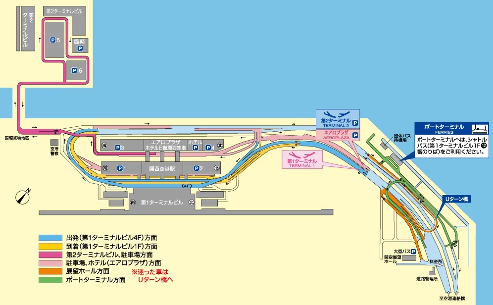 関空駐車場には、第1ターミナルに近い「P-1」~「P-4」、第2ターミナルに近い「P-5」「P-6」があります。