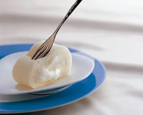 2種類のチーズに生クリームを加えたレアチーズクリームを、真っ白でふわふわしっとりのスポンジ生地でくるんだロールケーキは、なめらかで上品な美味しさ。