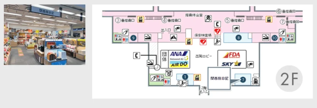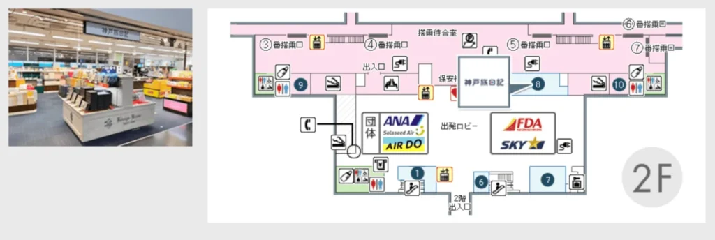 神戸空港のお土産売り場は、ターミナルビル2階の出発ロビー階に集中しています。