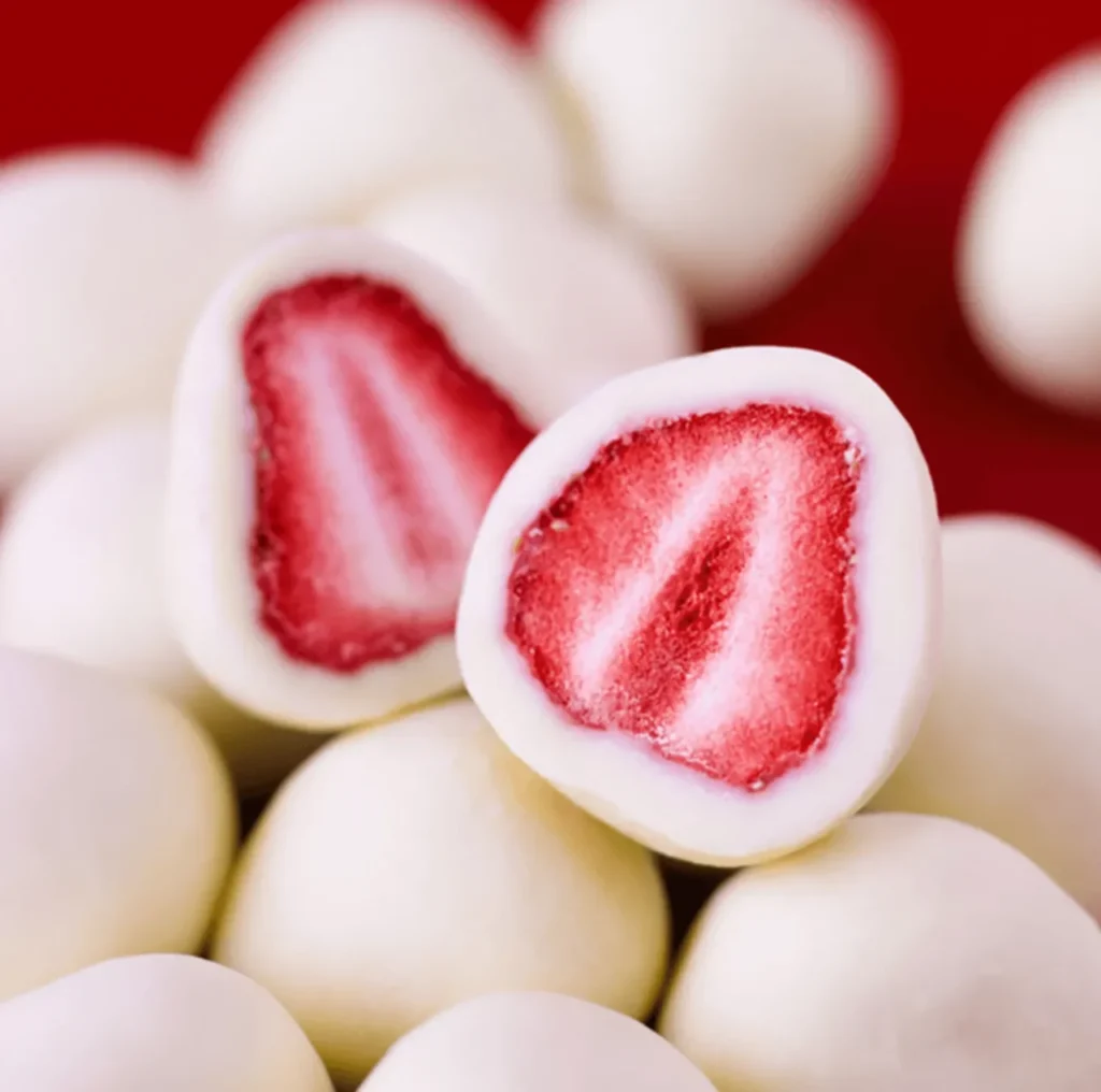 イチゴのおいしさがギュッと閉じ込められたフリーズドライの苺を、ほんのり甘いホワイトチョコレートでコーティングしたスイーツ。