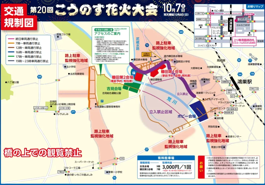 鴻巣花火大会2023の交通規制の場所は時間によって違います。