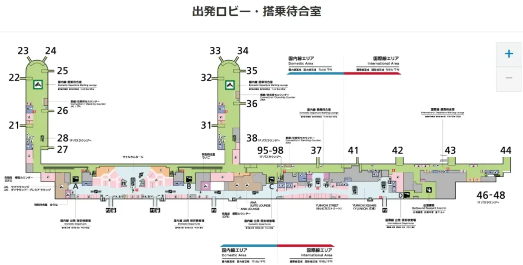 那覇空港のお土産売り場は、2階の出発ロビー・搭乗待機室に集まっています。