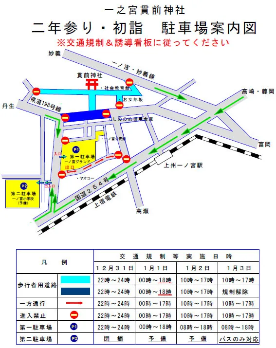 12月31日(日)~1月3日(水)までは、松山参道入り口より神社周辺~一ノ宮交差点より信用金庫交差点まで交通規制がかかります。