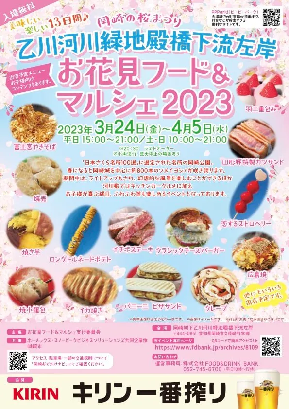 乙川河川緑地右岸エリア・岡崎公園二の丸エリアの屋台の出店期間は、2024年3月22日(金)~4月5日(金)まで。