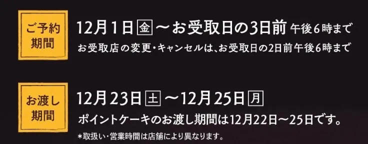 また、予約終了日はクリスマスケーキ受取日の3日前の午後6時となっています。