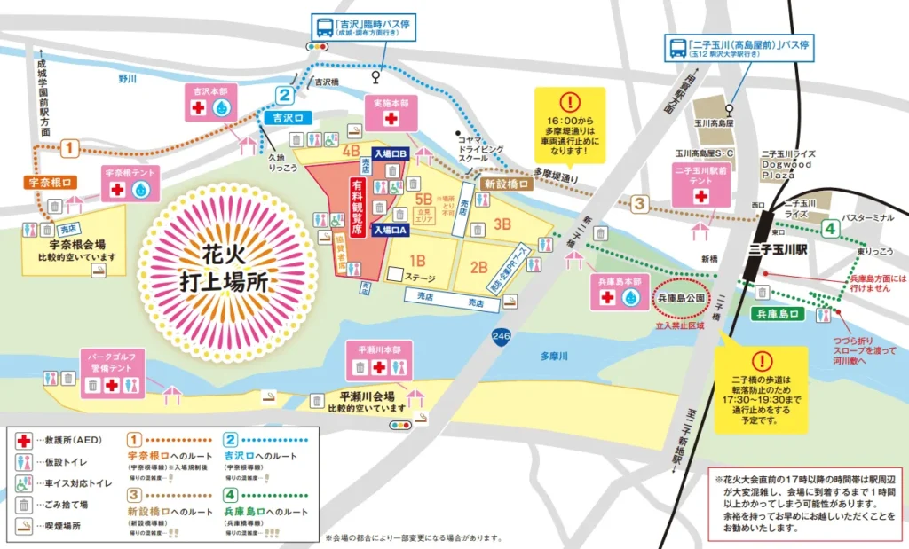 とくに東京都世田谷区で開催されるたまがわ花火大会では、あまりにも混雑すると無料観覧席への入場に規制がかかる可能性も。