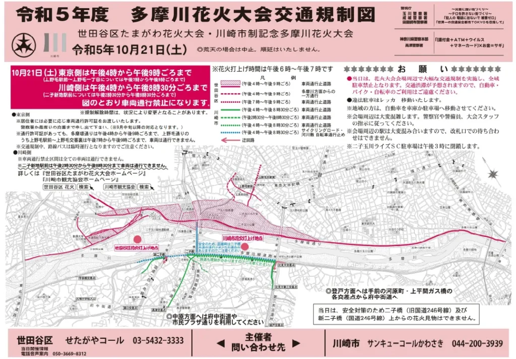 また、たまがわ花火大会でも川崎市制記念花火大会でも16:00~会場付近に交通規制がかかるので、余裕をもって会場に着くようにしましょう。