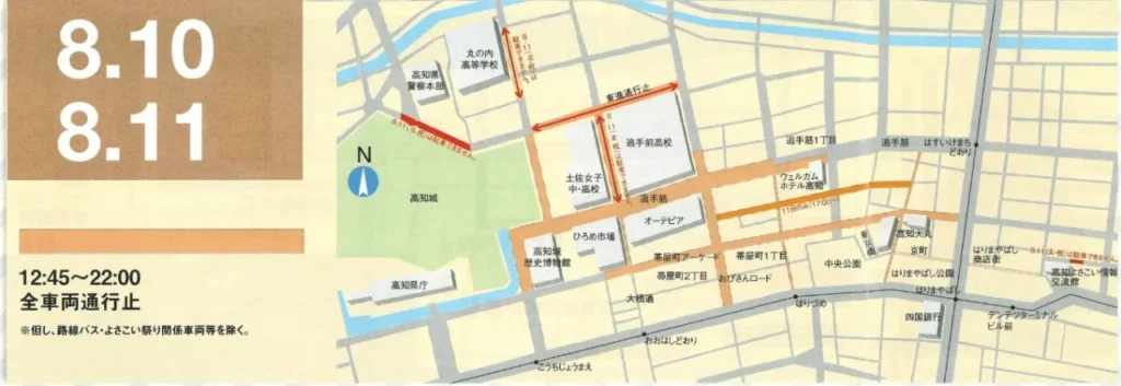 高知城・高知県庁を中心に大通りが全車両通行止め、本番には周辺施設の駐車場も利用できなくなります。